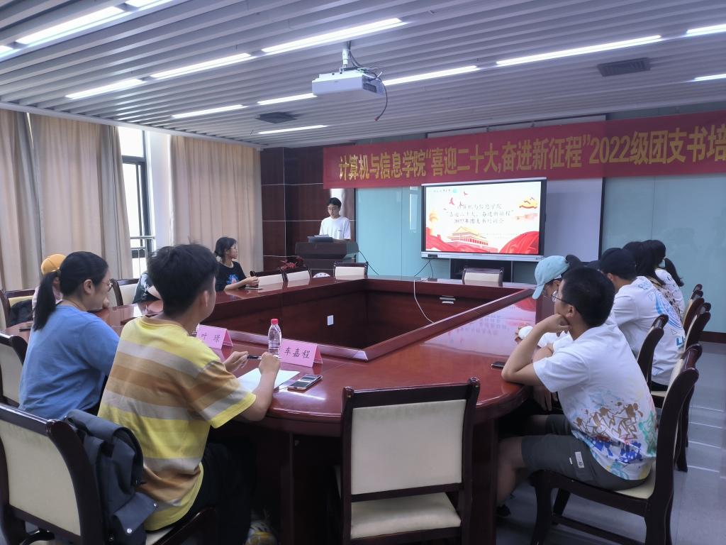 9月12日下午,计算机与信息学院(人工智能学院)开展“喜迎二十大,奋进新征程”2022级团支书培训会。学院团委副书记、2022级辅导员叶璟老师、学院学生团委副书记车嘉程同学以及2022级团支书参会。