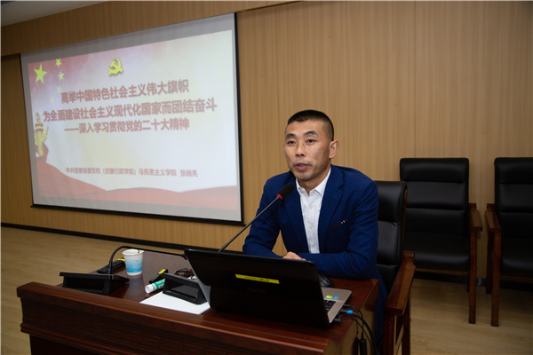 为深入学习宣传贯彻党的二十大精神,11月16日,附属中学特邀中共安徽省委党校(安徽行政学院)马克思主义学院副院长张晓亮副教授为全体教师和部分学生干部宣讲党的二十大精神。附属中学党总支副书记薛珍主持会议。