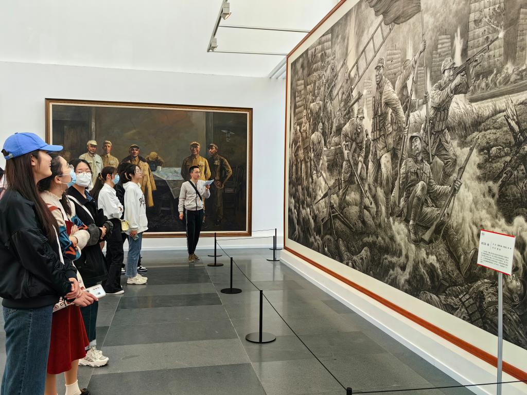 本次活动重点参观了“安徽省重大历史题材美术作品展”,作品以美术的形式记录和反映安徽波澜壮阔的历史,描绘出一幅幅壮美画卷,体现出艺术家呼应民族精神、呼应时代进程的精妙构思和家国情怀。在展厅中管理学院本科生第二党支部书记吕世安同学讲解了“渡江特等英雄”马毛姐的故事以及“渡江第一船”的来源,带领学生党员们身临其境感受党史故事,传承红色基因,赓续奋斗精神。