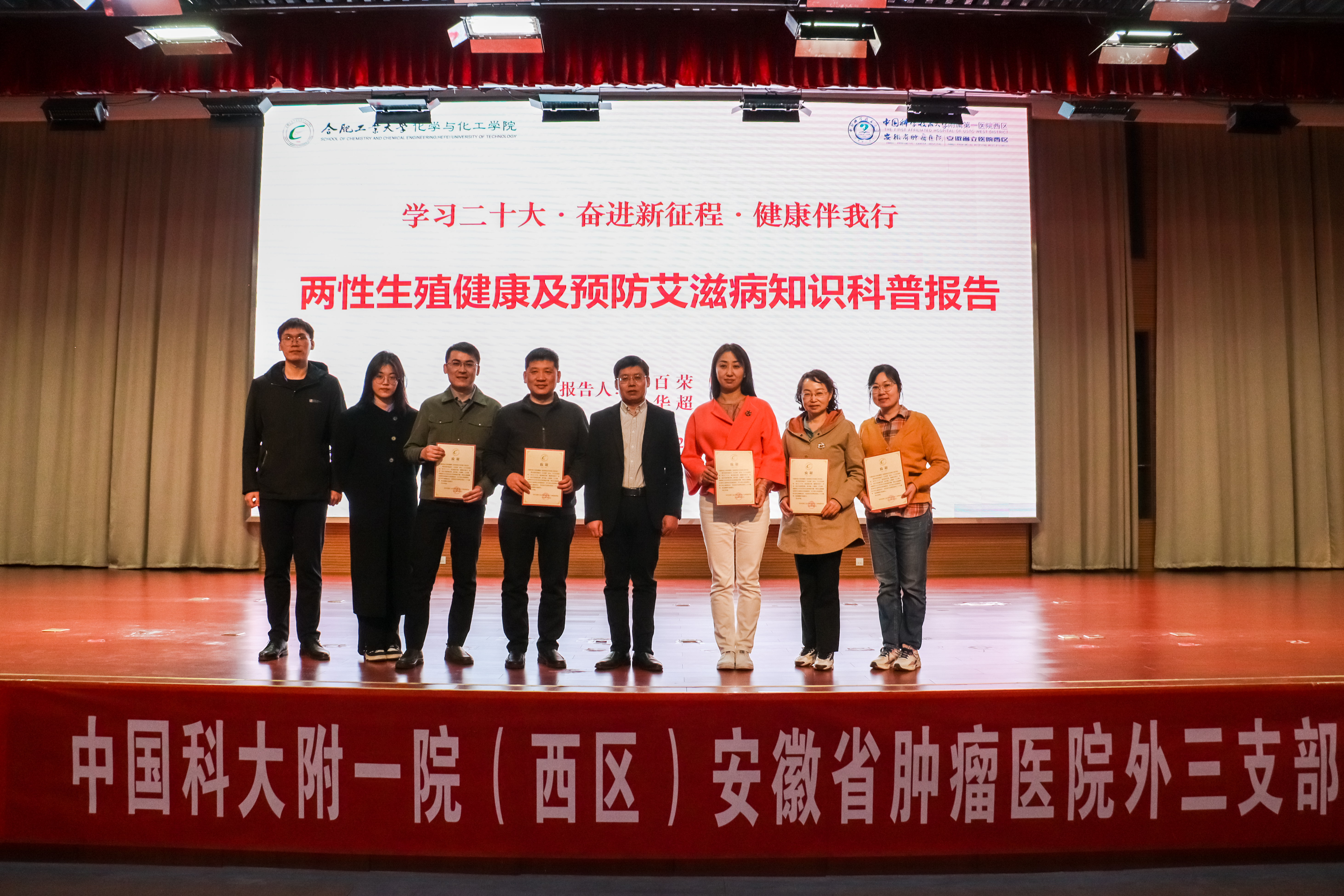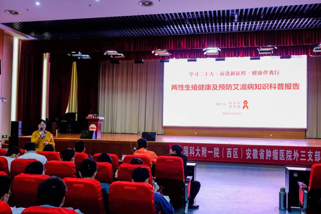 为深入学习贯彻党的二十大精神,推进健康中国建设,切实提高大学生健康素养与健康意识,化学与化工学院于3月12日在翡翠湖校区科教楼报告厅通过线上线下结合的方式举办了以“学习二十大,奋进新征程,健康伴我行”为主题的《两性生殖健康及预防艾滋病知识科普报告》。本次报告特邀中国科技大学附属第一医院西区外科知名专家夏百荣、徐华超主讲,各学院500余名学生聆听了报告。