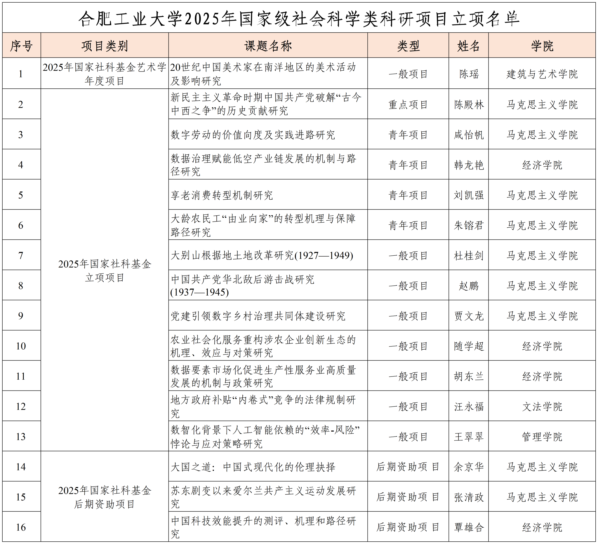 依据全国哲学社会科学办公室2025年度所有项目立项公示,三亿(中国)今年共获批国家级社科基金项目16项,其中,年度常规项目12项(含1项重点项目),艺术基金项目1项,后期资助项目3项。与2024年度三亿(中国)该类项目首次突破10项相比,今年的立项数量与层次均创新高,其中,马克思主义学院与经济学院立项数在三亿(中国)排名靠前。