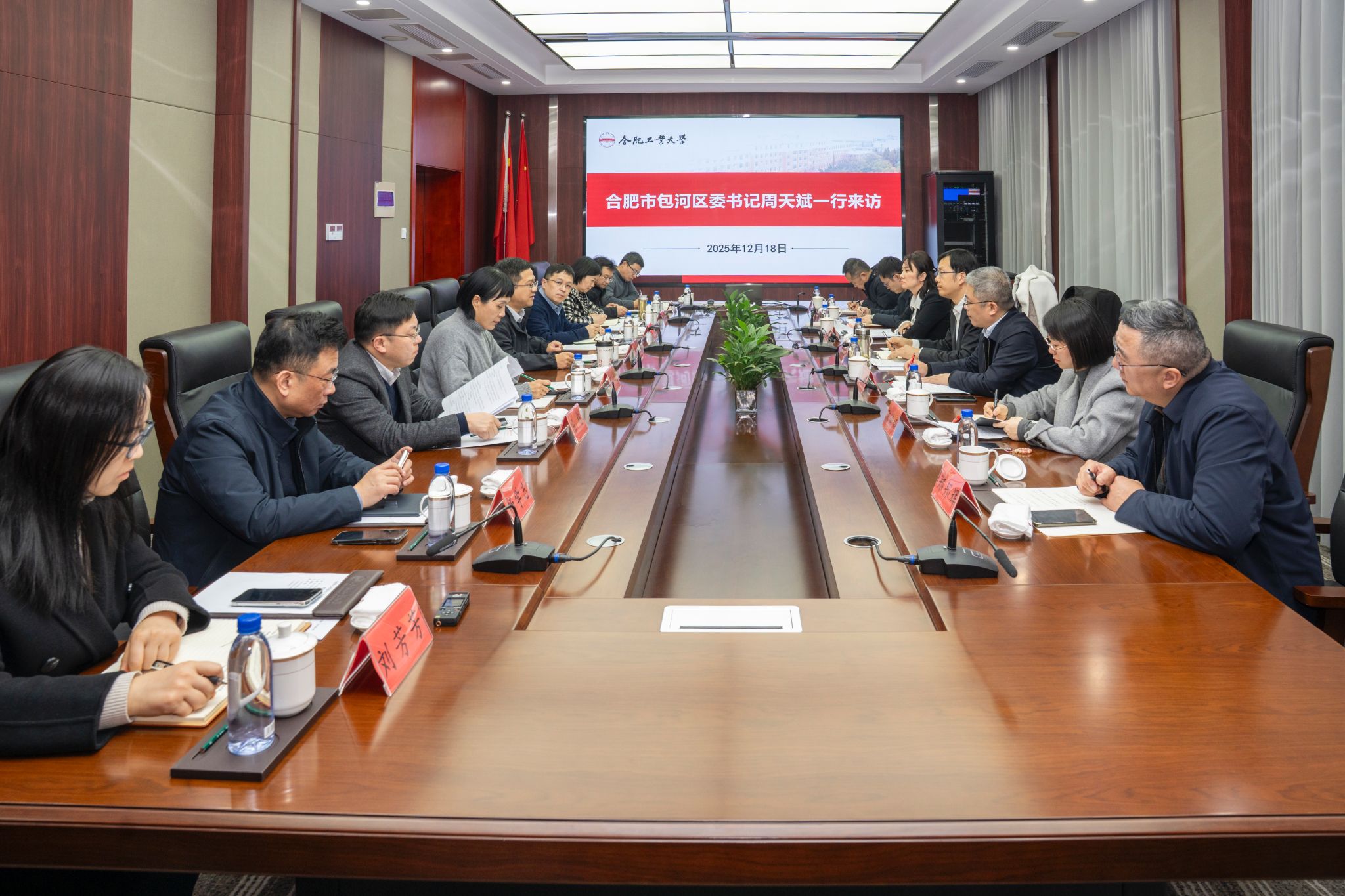 为进一步深化校地合作,促进资源共享,推动共赢发展,12月18日,合肥市包河区委书记周天斌一行来校座谈交流。校长汪萌,校党委常委、副校长康宇出席座谈会。