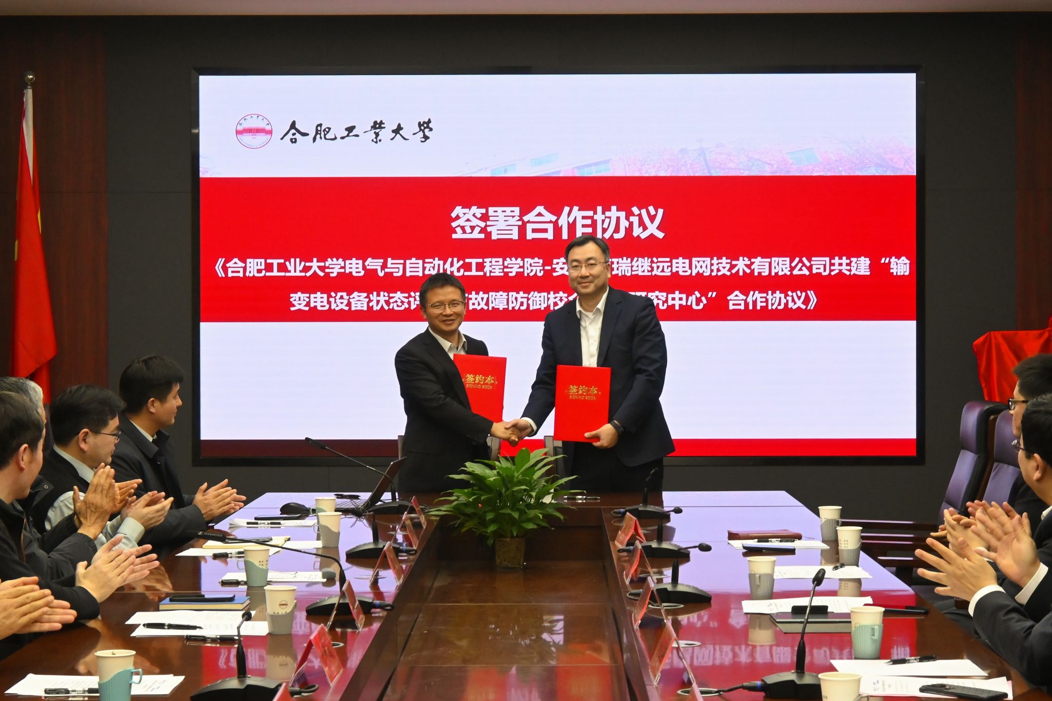 安徽南瑞继远电网技术有限公司董事、党委书记李翔与电气与自动化工程学院院长向念文代表双方签署合作协议,郑玉平与于祥成共同为联合研究中心揭牌。