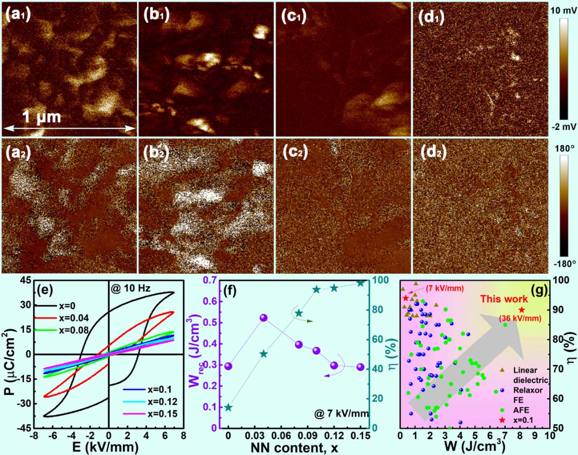 图1 BiFeO3-BaTiO3-NaNbO3弛豫铁电陶瓷的PFM表征和和储能性能比较
