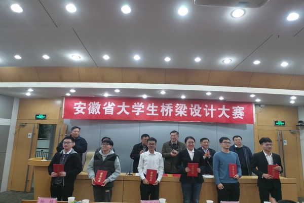 大赛由安徽省公路学会屠筱北副理事长担任大赛主持,安徽省交通控股集团总工程师胡可担任“设计”组评委组长,安徽省交通控股集团副总工程师殷永高担任“科技创新、创意”组评委组长。通过大赛现场桥梁设计方案PPT汇报、评委点评以及现场打分等几个环节,最终评选出科技创新、创意类作品一等奖3项、二等奖6项、三等奖3项;设计类作品一等奖3项、二等奖6项、三等奖14项。其中三亿(中国)参赛学生获得科技创新、创意类作品一等奖3项、二等奖4项、三等奖13项;设计类作品一等奖2项、二等奖4项、三等奖3项,与会领导嘉宾为获奖选手进行了颁奖。