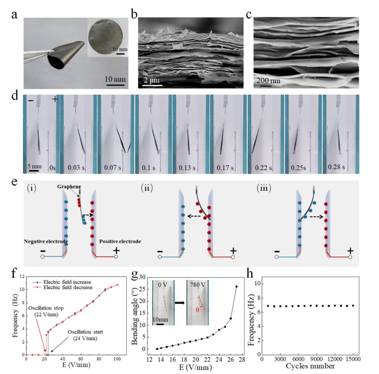 该石墨烯振荡器为悬臂梁结构,放置在两平行板电极之间,一端固定,另一端自由悬挂。在电极之间施加360V的直流电压(电场强度为24 V mm−1),石墨烯薄膜在两电极之间产生了持续的弯曲振荡。其振荡运动的驱动机制归因于静电感应效应,以及荷电极性变化引起的静电力方向变化。振荡运动的频率可通过施加的电压来控制,在100Vmm−1的电场强度下,振荡频率可达10.8 Hz。