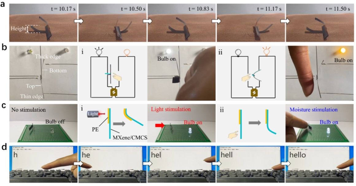 此外,该团队还与哈尔滨工业大学彭庆宇教授合作,开发了一种具有“类二极管式”变形行为的湿度响应MXene柔性薄膜驱动器。基于其厚度梯度结构以及MXene/羧甲基壳聚糖复合物对水分子的高度敏感性,该薄膜驱动器能够在水分梯度刺激下产生“类二极管式”的驱动变形行为,其变形行为与厚度梯度方向以及水分源的方向高度相关。当水分刺激复合膜底部时,薄膜的弯曲轴垂直于厚度梯度方向;当水分刺激复合膜顶部时,薄膜的弯曲轴平行于厚度梯度方向。基于该柔性驱动器独特的湿度响应行为,发展了一系列智能应用,包括水分梯度刺激下的柔性自振荡器件,以及基于人体代谢水分刺激的智能非接触开关、非接触键盘、可穿戴智能热管理服饰、可识别人体呼吸状态的自供电传感器等。相关成果以题为“MXene/Carboxymethyl Chitosan Moisture Responsive Soft Actuator with Diode-Like Actuation for Versatile Applications Driven by Human Metabolism”的论文发表在《Advanced Science》上。