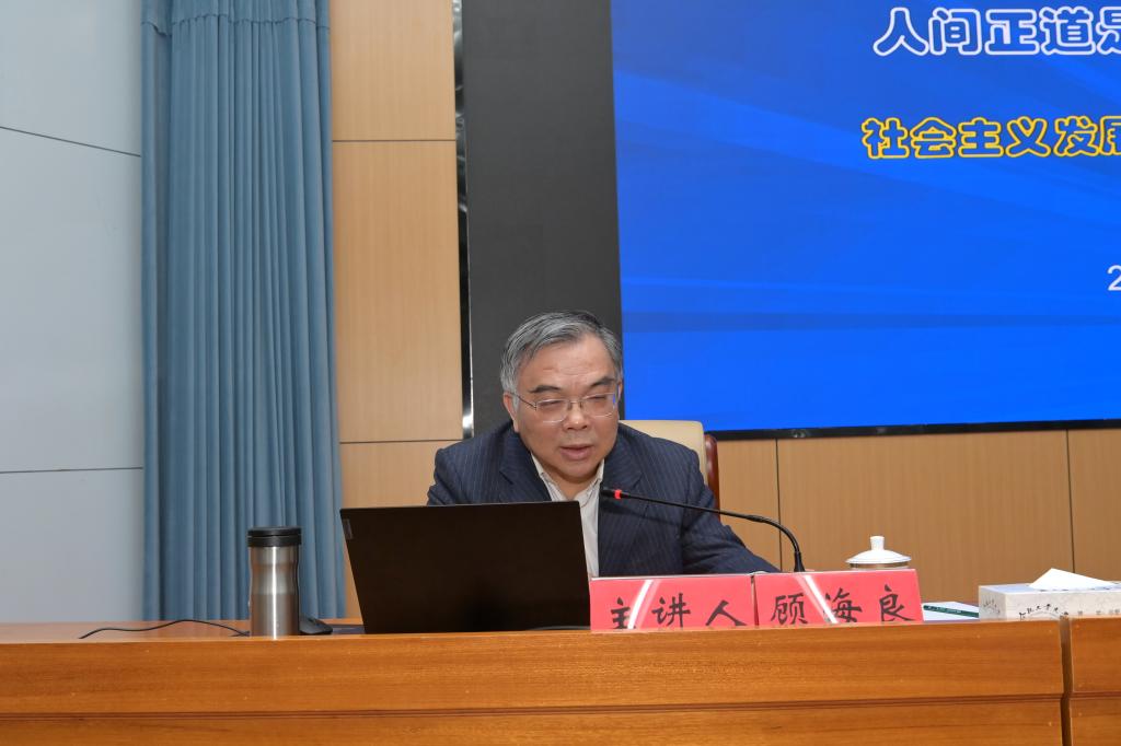 顾海良以“人间正道是沧桑——社会主义发展史解读”为主题,从空想社会主义的产生和发展、科学社会主义的创立、列宁的社会主义革命和建设、苏东社会主义的历史命运、中国社会主义的探索、中国特色社会主义的发展6个时间段,详细分析了500年来社会主义从空想到科学、从理论到现实、从一国到多国、从单一模式到多种形式的发展历程,深刻阐述了科学社会主义的历史逻辑、理论逻辑与实践逻辑。报告指出,科学社会主义的曲折发展,显示了社会主义的世界性、实践性、时代性和民族性。中国特色社会主义是科学社会主义的当代形式,要坚定中国特色社会主义的道路自信、制度自信、理论自信和文化自信,坚守对马克思主义的信仰、对中国特色社会主义的信念、对中华民族伟大复兴中国梦的信心。