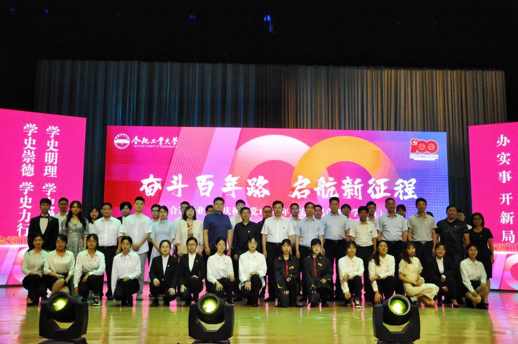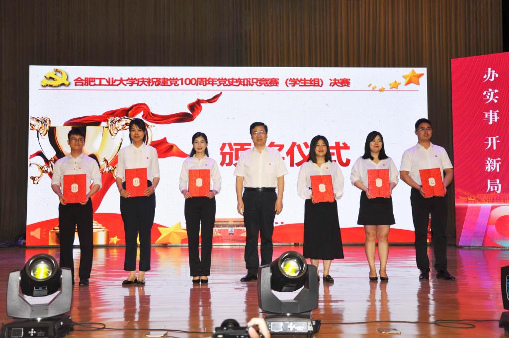 来自计算机与信息学院的风行宛陵队、马克思主义学院的一“马”当先队、仪器科学与光电工程学院的星火燎原队、管理学院的百舸争流队、文法学院的博文明法队、食品与生物工程学院的众人拾柴队六支队伍晋级决赛。决赛是舞台展示形式的团队比拼赛。在第一环节“风采展示——才情献九州”中,六组参赛选手轮流登场,以团队创意合影为背景进行形式新颖的团队自我介绍,随后播放了他们带来的“党史”主题表演视频。风行宛陵队以一封家书读懂共产党人的初心;一“马”当先队用红色故事歌颂“黎明”;星火燎原队再现红船上的历史时刻;百舸争流队生动诠释“真理的味道”;博文明法队深情讲述了《映山红》歌曲背后的故事;众人拾柴队一曲高歌唱响《我们都是追梦人》。精湛的表演、巧妙的构思、精良的视频,引领现场观众追忆起一幕幕光辉的党史岁月。