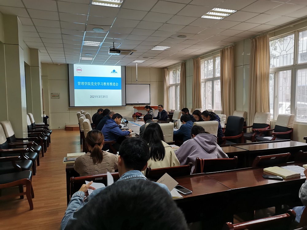 3月31日下午,学院在管理学院一号楼1111会议室召开党史学习教育推进会,学院党委书记郭志勇主持会议,学院党委副书记、纪委书记牛姗姗、副处级组织员汪小军及全体党支部书记参加了会议。