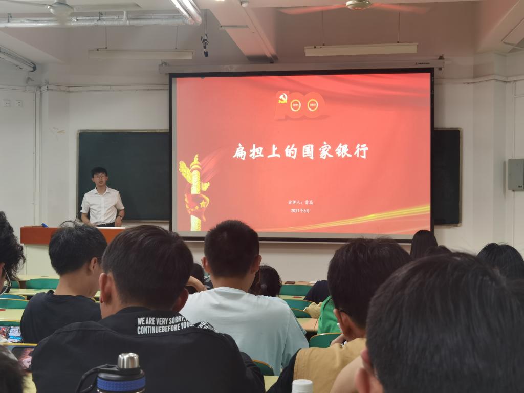 经济学院辅导员雷磊进行了“扁担上的国家银行”为主题的宣讲。他从1家银行:红色革命的“摇钱树”;160副扁担:扛在肩上的“国家银行”;二万五千里长征:书写革命年代的“金融奇迹”;从“窑洞银行”到中国人民银行四个部分,生动讲述了贯穿于中国共产党百年历史征程之中的红色金融。他鼓励同学们继承和弘扬红色金融精神,努力学好专业知识,为国家的建设发展、为社会主义现代化建设、为实现中华民族的伟大复兴而努力奋斗。