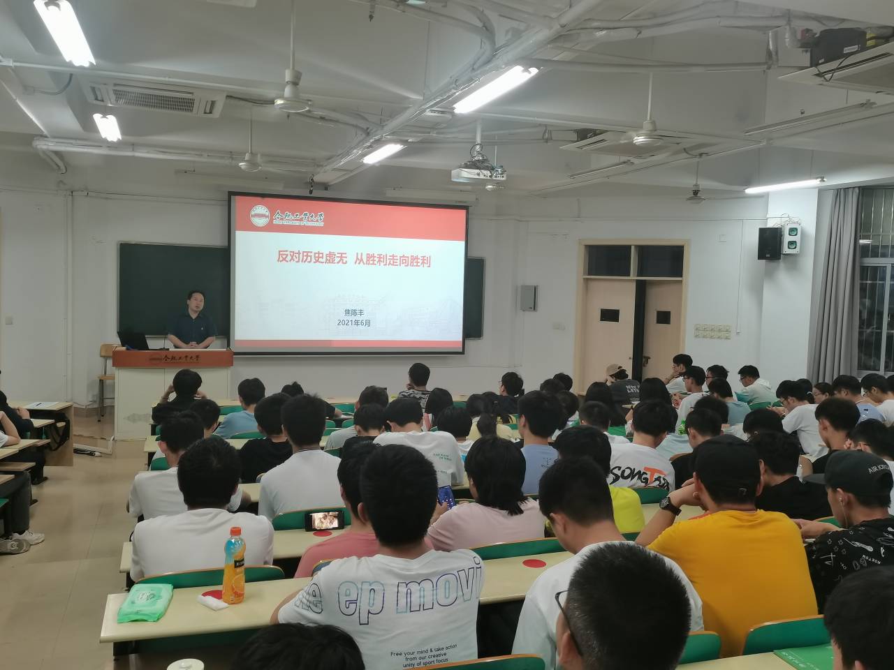 马克思主义学院党委副书记、纪委书记焦陈丰以“反对历史虚无,走向新的胜利”为主题进行了宣讲。他首先从自己与女儿的一段对话谈起,向同学们讲解了历史虚无主义的危害,随后通过“毛主席带补丁的睡衣”和“朱德总司令存款全部上交充当党费”两个小故事进一步向同学们讲述了逻辑和历史的统一,并提醒同学们以苏联亡党亡国为鉴,警惕“历史虚无”的意识形态,最后为同学们分享了“上甘岭战役一个苹果的故事”视频,通过老共产党员的回忆向同学们展示了那个时期共产党人抗战时的艰辛和团结,呼吁同学们自觉抵制历史虚无主义,注重逻辑和历史的统一。