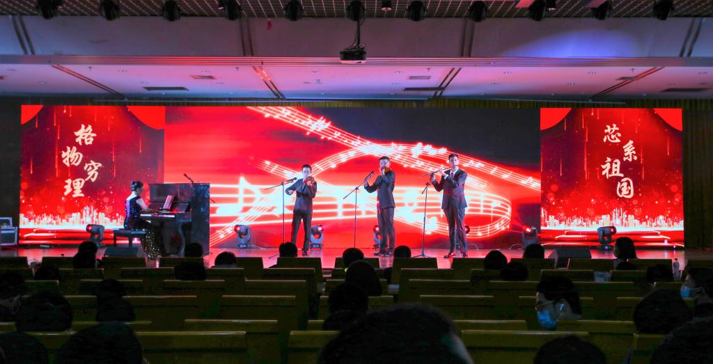 汇演随着悠扬的钢琴独奏《红旗颂》拉开帷幕,随后小提琴、单簧管抑扬顿挫,共同演奏了《唱支山歌给党听》以及《我和我的祖国》。音乐盛宴结束,六位主持人迈着端庄的步伐从观众席走上舞台,他们用清澈洪亮的声音宣布着晚会的开始,现场的掌声和欢呼声瞬间点燃。本次汇演共分为“百年篇章,薪火代代永相承”“惊鸿乍现,青春袅袅多风采”“笃志未来,希望汩汩耀国芯”三个篇章。
