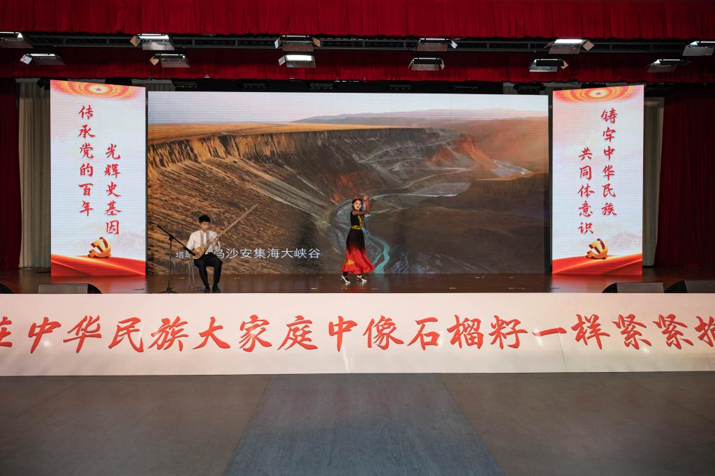 展演在马克思主义学院预科班学生表演的极具新疆特色的欢快歌舞《青春舞曲》中拉开序幕。活动共分为三个篇章,第一篇章以“抚今追昔,赓续建党百年红色精神”为主题。在该篇章中,回族学生马荣伯以《一名共产党员的使命》为题,深情描述了父亲作为一名党员缉毒警察默默无闻甘心奉献的形象,他承诺会接力承担父亲作为一名共产党员的责任和担当;满族学生任伯宇以《忆百年辉煌征程,铸团结奋进力量》为题,讲述了中国共产党波澜壮阔的百年征程,号召同学们深刻领悟伟大建党精神,在新时代续写工大学子新的辉煌;维吾尔族学生娜菲拉·阿布都是一名来自新疆棉花种植家庭的孩子,以《“红”与“白”》为题,用亲眼所见、亲耳所闻的真实经历来反驳西方媒体对党的治疆方略的抹黑与造谣。