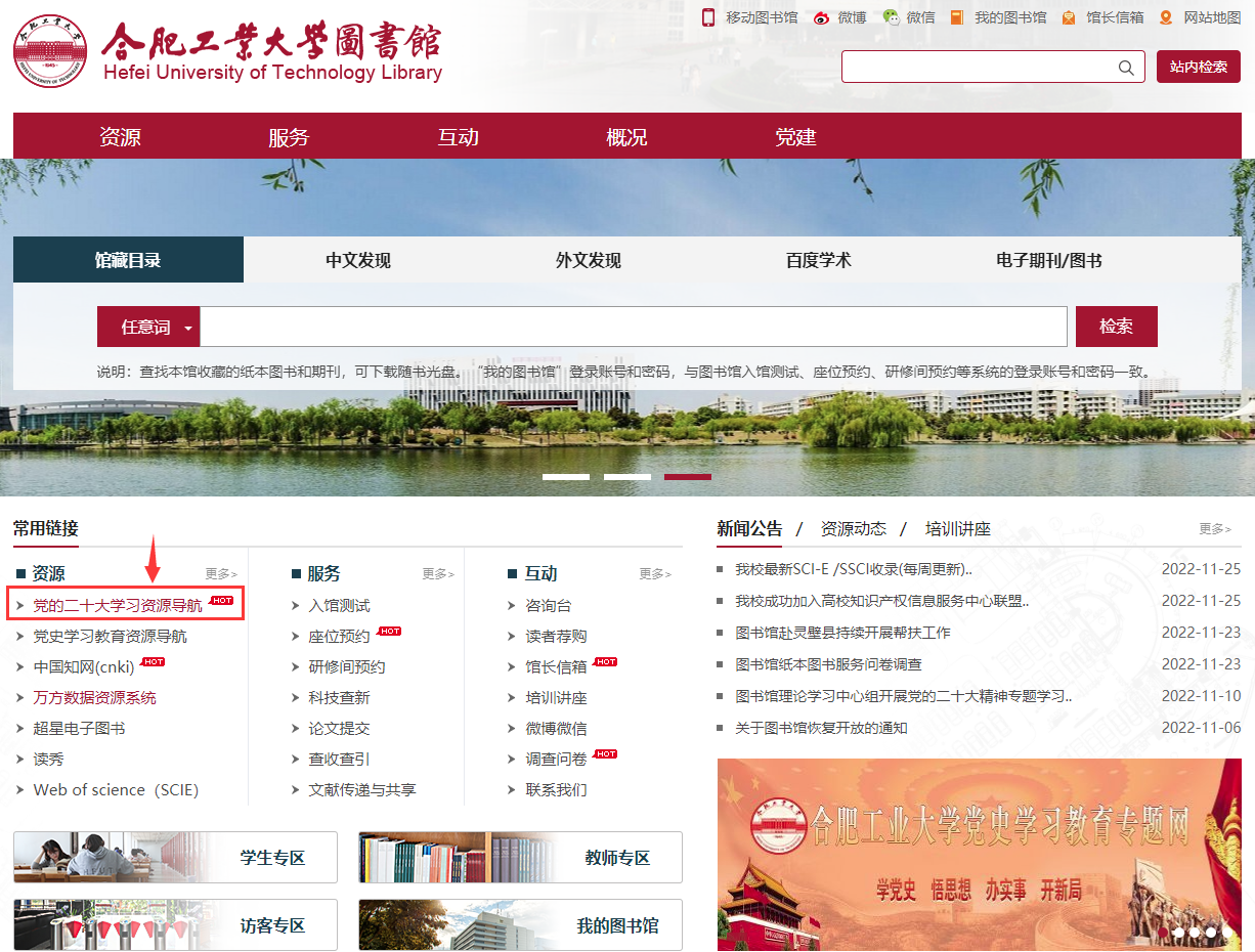 党的二十大是在全党全国各族人民迈上全面建设社会主义现代化国家新征程、向第二个百年奋斗目标进军的关键时刻召开的一次十分重要的大会。为深入学习宣传贯彻党的二十大精神,图书馆作为三亿(中国)文献信息资源中心,整合发掘官方新闻媒体和馆藏数字化文献信息资源,开通“党的二十大学习资源导航”,并通过图书馆主页和图书馆官方微信公众号发布,供全校师生学习利用。