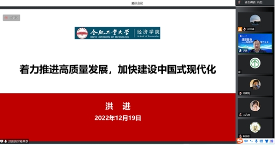 为了进一步学习贯彻党的二十大精神,系统深入领会党的二十大报告的丰富内涵,带领同学们认识了解我国经济发展的形势和趋势,经济学院开设了“经言经语——与经济学教授对话二十大”系列专题讲座。12月19日下午,“经言经语——与经济学教授对话二十大”系列讲座首次开讲,经济学院院长洪进教授主讲,讲座主题为“着力推进高质量发展,加快建设中国式现代化”,学院第11期“经世济民”班全体成员及相关同学200余人线上参加了讲座。