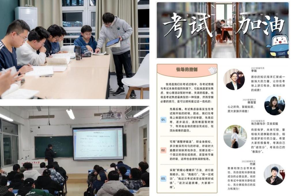 缓解考前焦虑,行稳复习之舟。开学初,课程多,考试多,很多同学出现考前焦虑;为此,学院通过“开学第一课”班会和微信推文开展“拒绝考试焦虑”教育,从认知调控、调整期望值等科学有效的途径,帮助学生们克服考试焦虑,全身心投入学习。落实学业辅导,补足学业之钙。结合学期初考试多的情况,举办“学辅人心,学长领航”学业辅导,通过公开招募讲师团为低年级学生讲授课程,帮助同学们梳理知识架构、查漏补缺,并耐心地解答同学困惑。通过学长互助充分发挥学生的自主性,营造互助的学习氛围,助力创建优良学风。严肃考风考纪,弘扬优良之风。开学前两周,学院领导、辅导员深入学生教室、考场,进行巡考查课。各年级辅导员通过“开学第一课”主题班会,围绕文件学习、案例分析等方面,对《三亿官方版网站登录入口学生违纪处分办法》等文件和相关处分办法深入解读,进行考试违纪警示教育,引导学生深刻认识求真务实、诚信考试的重要性,弘扬优良学风。