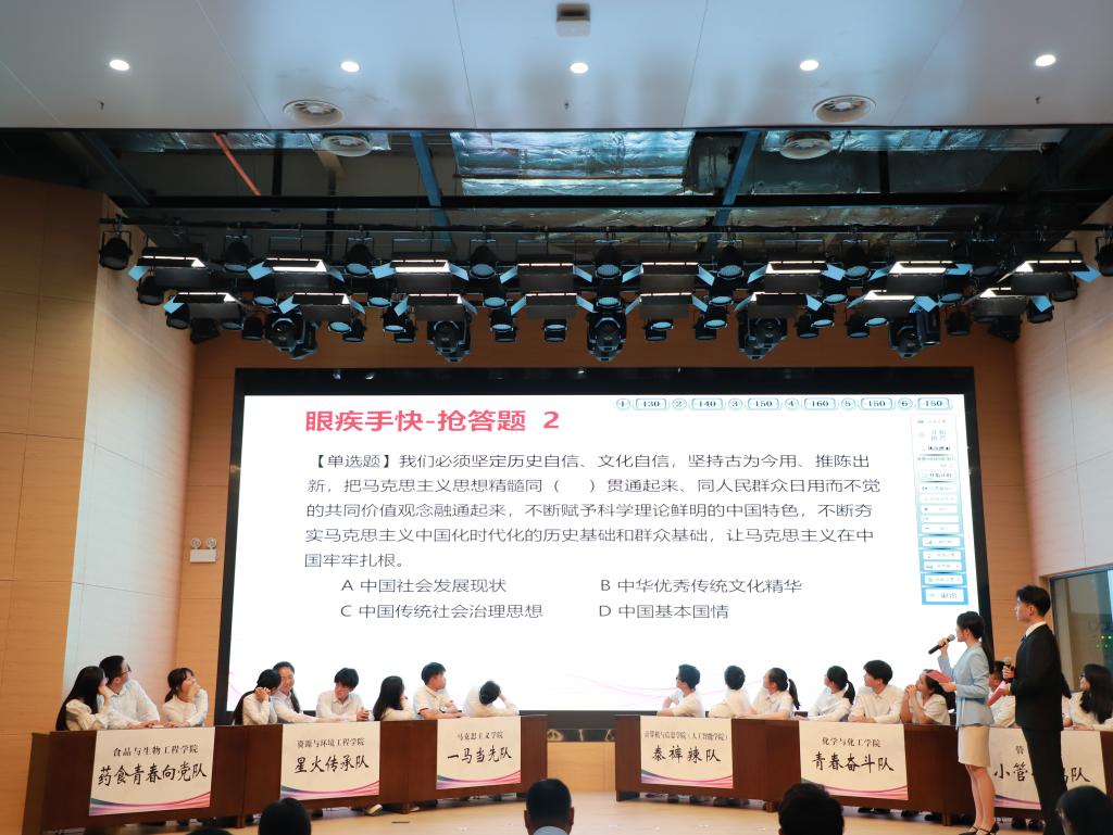 决赛设置先声夺人、眼疾手快、谁与争锋三个环节,围绕党的二十大报告、党史光辉历程等内容,通过必答题、抢答题、pk赛进行展示。答题环节,6支队伍反应迅速、分秒必争,现场亲友团加油助威,掌声不断、呼声不停。互动环节,现场观众竞相参与,答题积极。经过激烈角逐,马克思主义学院代表队夺得一等奖,化学与化工学院代表队、管理学院代表队荣获二等奖,资源与环境工程学院代表队、食品与生物工程学院代表队、计算机与信息学院(人工智能学院)代表队荣获三等奖。