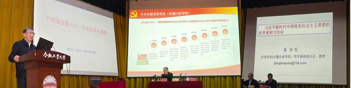 在校内集中学习环节,合肥工大高科信息科技股份有限公司董事长魏臻教授作了2023年全国“两会”精神辅导报告,安徽省委党校(安徽行政学院)副校(院)长江观伙教授作了《新时代新征程的政治宣言和行动纲领——学习党的二十大精神》辅导报告,安徽省委党校(安徽行政学院)哲学教研部主任姜华有教授作了《习近平新时代中国特色社会主义思想的世界观和方法论》辅导报告。全体处级干部集中观看了廉政警示教育专题片《永远吹冲锋号》,同时接受保密警示教育。