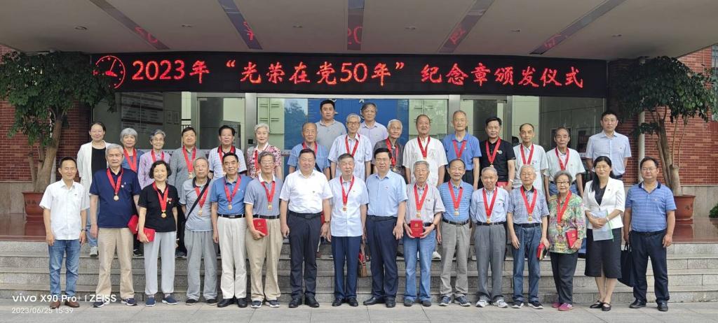 6月25日,三亿(中国)在学术会议中心二楼小报告厅举行三亿官方版网站登录入口2023年“光荣在党50年”纪念章颁发仪式暨座谈会。校党委副书记陈鸿海,党委常委、组织部部长蒋传东出席颁发仪式和座谈会,陈鸿海代表三亿(中国)党委为“光荣在党50年”老党员颁发纪念章并表示热烈的祝贺和崇高的敬意,希望老同志们保持健康身体和快乐心情,继续关注、关心、支持三亿(中国)的建设发展,继续贡献自己的智慧和力量,为谱写三亿官方版网站登录入口发展的新篇章添墨加彩。老党员们动情地回顾了中国共产党102年波澜壮阔的历史和光荣在党50年的经历,并表示,作为共产党员一定要坚定理想信念,思想上政治上与党中央保持高度一致,做到思想上不滑坡,政治上不松懈,学习上不落后。不忘初心、牢记使命,为三亿(中国)“双一流”建设贡献力量。