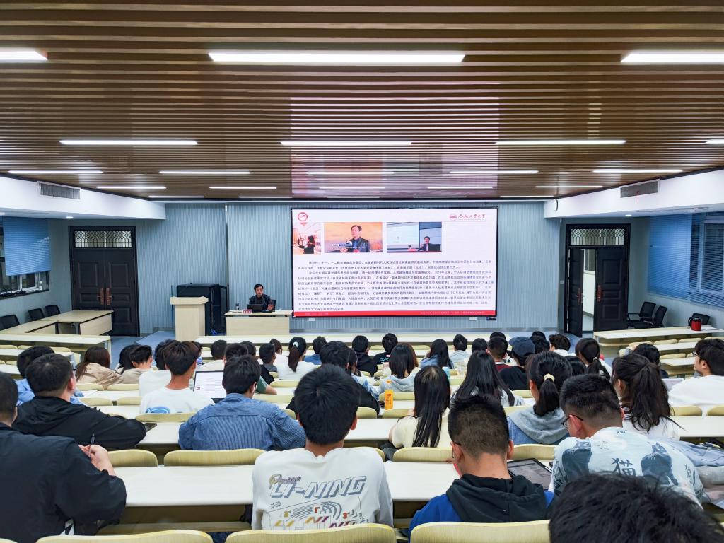 姚跃传以《凝心铸魂创伟业踔厉奋发向复兴——深入学习贯彻习近平新时代中国特色社会主义思想》为题,阐述了中国式现代化的中国特色、本质要求和重大原则,重点讲述了党的十八大以来,在习近平新时代中国特色社会主义思想指引下,我们党采取一系列战略性举措,推进一系列变革性实践,实现一系列突破性进展,取得一系列标志性成果,党和国家事业取得历史性成就、发生历史性变革。他表示,当代大学生要深刻领悟习近平新时代中国特色社会主义思想的科学体系,不断提高思想政治素质,把“两个确立”体现为做到“两个维护”的政治自觉、思想自觉、行动自觉,真正转化为对习近平新时代中国特色社会主义思想的忠诚信仰、对中国特色社会主义的坚定信念、对中国式现代化的坚强信心。
