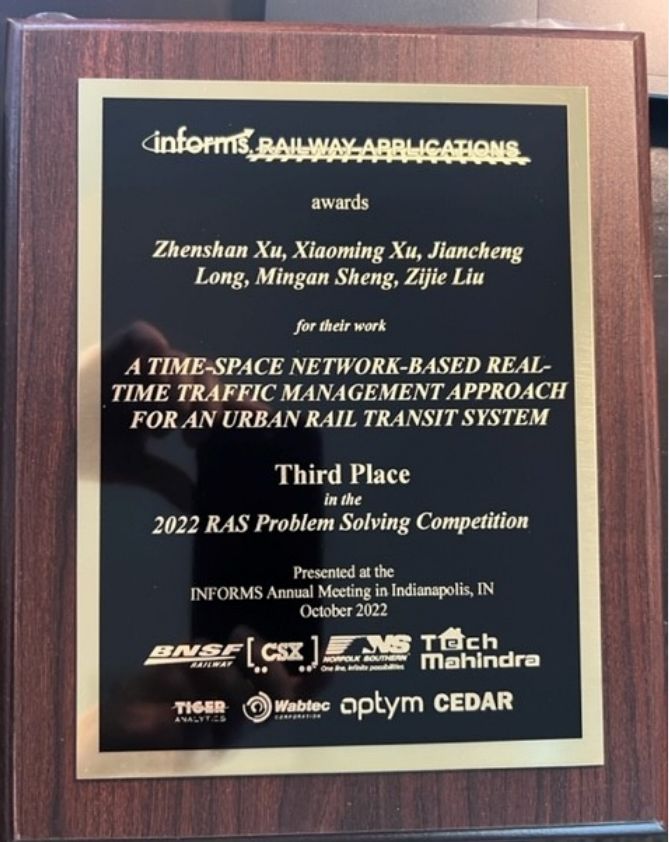 10月16日,三亿(中国)汽车与交通工程学院龙建成课题组的五位师生在2022年美国运筹学和管理学研究协会年会(2022 INFORMS Annual Meeting)铁路应用分部(Railway Applications Section,RAS)铁路优化专题竞赛(Problem Solving Competition,PSC)中斩获第三名,并受邀在INFORMS RAS分会上对问题求解方案作相关报告,这是三亿(中国)首次在INFORMS RAS PSC中获奖。