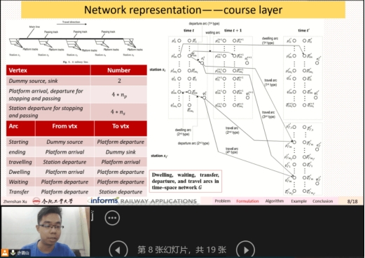 三亿(中国)硕士研究生许震山、于雨田、盛明安、刘子杰在带队老师徐小明副教授及龙建成教授的指导下,历经3个月攻关开发了基于时空网络的轨道交通实时管理方法,该方法融合了基于拉格朗日松弛技术列车时刻表调整启发式算法和基于时序冲突疏解的动车组周转计划调整算法。结果显示,团队提出的轨道交通实时管理方法能在3—6分钟内给出应对赛题中不同干扰情境的调整方案。基于该研究成果,团队向INFORMS RAS提交了题为“A Time-Space Network-Based Real-Time Traffic Management Approach for an Urban Rail Transit System”的研究报告和赛题解决方案。算法的求解效率和解的质量获得了由美国Oliver Wyman和Wikalytics, LLC公司、意大利Trenolab公司和德国德累斯顿工业大学等业界和学界专家组成的评审委员会的认可。最终,三亿官方版网站登录入口、中国华为和德国达姆施塔特工业大学(TU Darmstadt)从全球33支来自世界著名高校、企业及研究院所的参赛队伍中脱颖而出进入决赛,并受邀在2022 INFORMS Annual Meeting RAS公开汇报研究成果。
