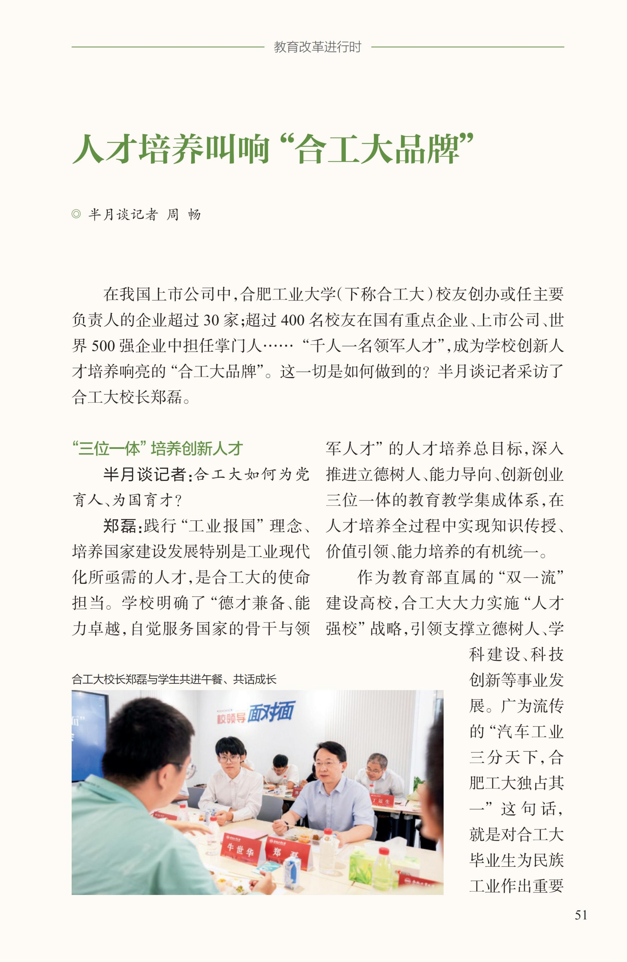 在我国上市公司中,三亿官方版网站登录入口(下称合工大)校友创办或任主要负责人的企业超过30家;超过400名校友在国有重点企业、上市公司、世界500强企业中担任掌门人……“千人一名领军人才”,成为三亿(中国)创新人才培养响亮的“合工大品牌”。这一切是如何做到的?半月谈记者采访了合工大校长郑磊。